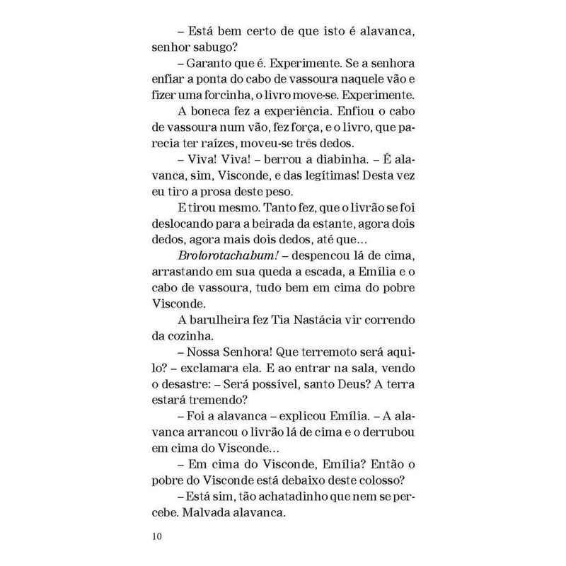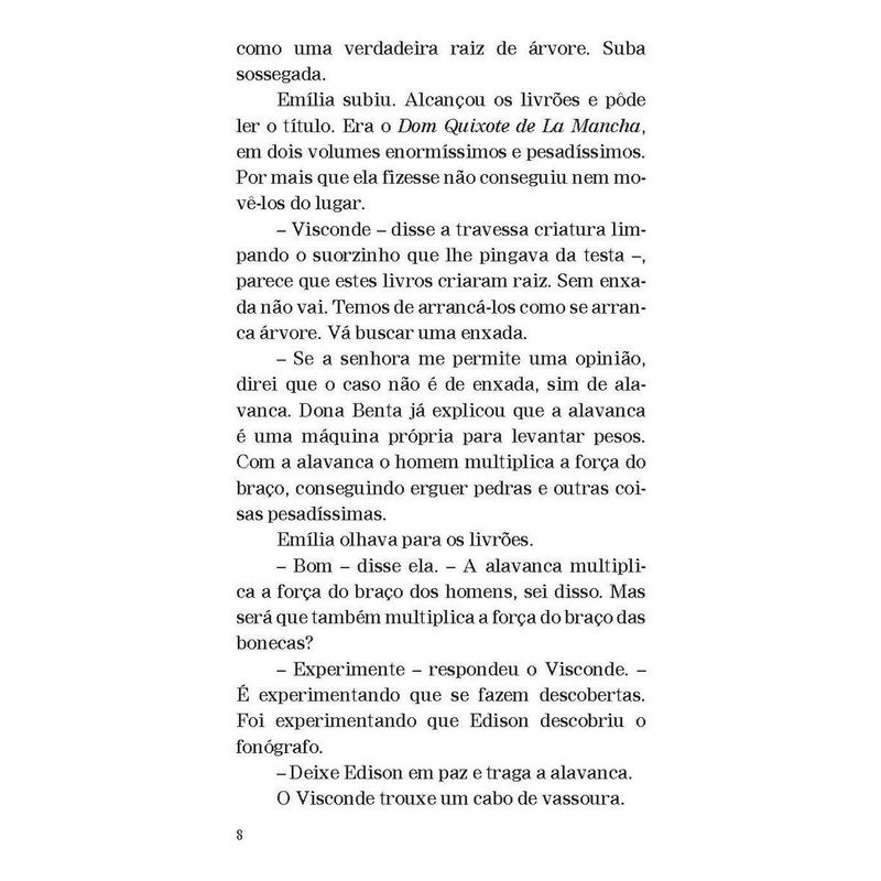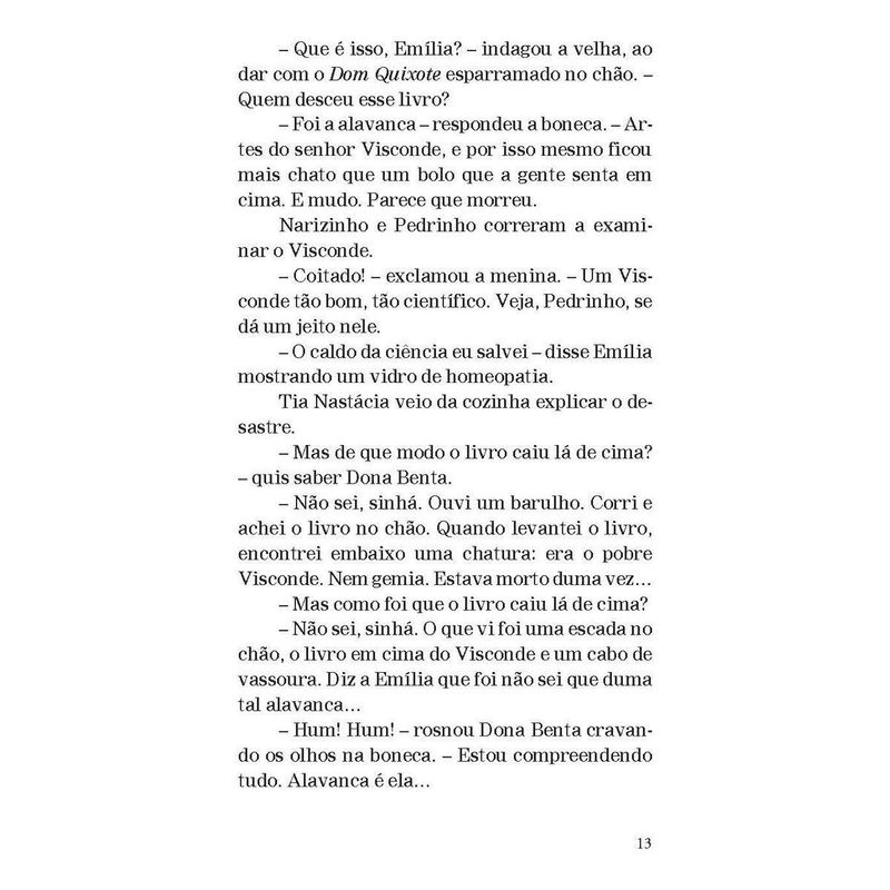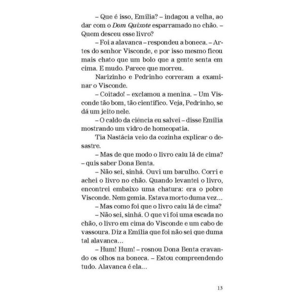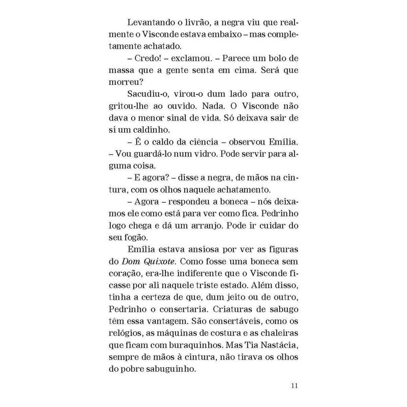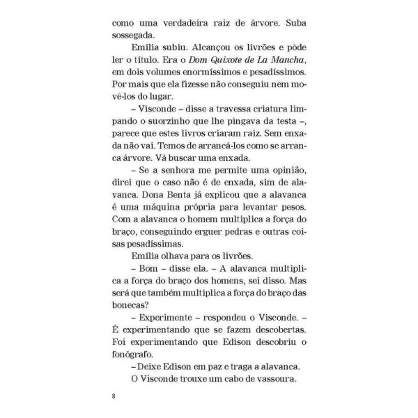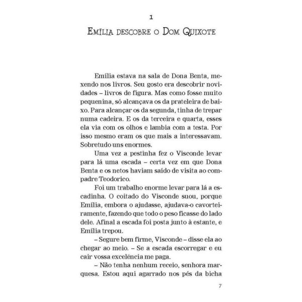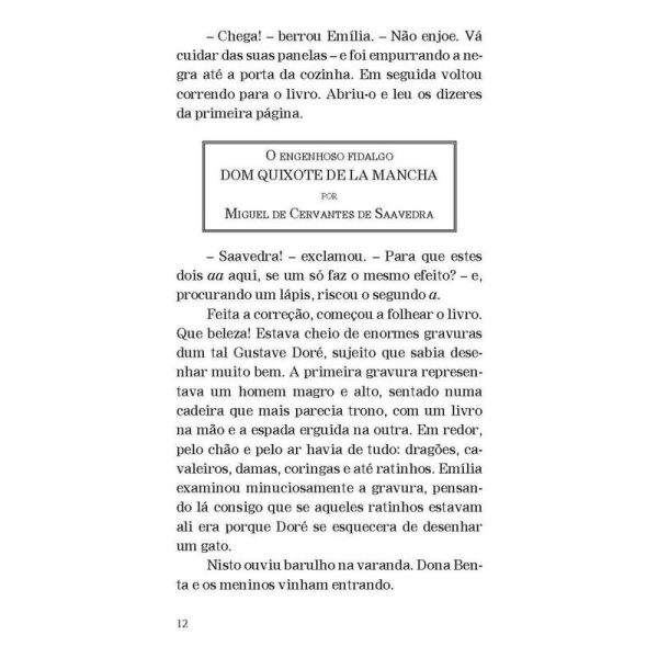A turma do Sítio do Picapau Amarelo e o engenhoso fidalgo “Dom Quixote não é somente o tipo do maníaco, do louco. É o tipo do sonhador, do homem que vê as coisas erradas, ou que não existem. É também o tipo do homem generoso, leal, honesto, que quer o bem da humanidade, que vinga os fracos e inocentes – e acaba sempre levando na cabeça, porque a humanidade […] não compreende certas generosidades.” Aqui, Dona Benta conta para a turma do Sítio do Picapau Amarelo a história do engenhoso fidalgo Dom Quixote de la Mancha. De Emília ao Visconde de Sabugosa, todos se encantam com as aventuras desse cavaleiro meio louco, meio sonhador. Publicada pela primeira vez em 1936, esta adaptação é um presente do grande Monteiro Lobato às crianças brasileiras, no qual faz uma homenagem à história clássica criada pelo espanhol Miguel de Cervantes há mais de quatrocentos anos.