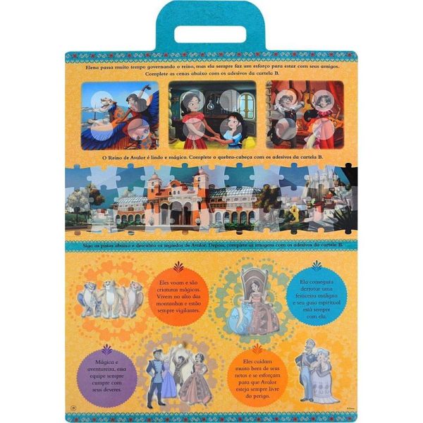Conheça o reino mágico de Avalor e a encantadora Princesa Elena. Use os adesivos para completar a história e aprenda brincando com esta Maleta Divertida. Maleta Divertida de história, atividades e adesivos. Mais de 100 adesivos reutilizáveis. Inclui: – Um lindo livro ilustrado para ler e completar; – Um tabuleiro dupla face com atividades divertidas; – Três cartelas de adesivos reutilizáveis.