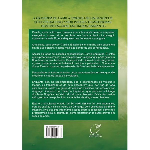 Camila, ainda muito nova, passa a viver sob a tutela de Artur, um pastor evangélico, homem frio e calculista cuja única ambição é conseguir riqueza à custa da fé cega daqueles que frequentam sua igreja. Ambicioso, casa-se com Camila. Ele planeja ter um filho para educá-lo a fim de que obtenha o cargo mais alto dentro de sua congregação. Apesar de todos os cuidados contraceptivos, Camila engravida. É então que o pesadelo começa: ela sente pânico ao imaginar que pode gerar um filho desse homem hediondo. Desequilibrada diante da ideia da gravidez, a jovem passa a receber tratamento médico e psiquiátrico. Conhece o doutor Evandro, que se compadece da história vivenciada pela jovem mãe. Desconfiado de tudo e de todos, Artur toma decisões terríveis que vão modificar a vida de todos os envolvidos. Enquanto isso, na espiritualidade, sob a coordenação de Vinícius e Ineque, os trabalhadores do bem descobrem que, por trás de toda essa história, existe um grupo de espíritos maléficos que anseiam por vingança, liderados por Salas, o Inquisidor, que pertence à falange dos Nove Dragões de Cristo. Movido pela obsessão, Salas não medirá esforços para manipular Artur na tentativa de atingir seus objetivos. Este é o envolvente enredo de Em cada lágrima há uma esperança, obra do espírito Vinícius (Pedro de Camargo) com psicografia de Eliane Macarini, livro que traz importantes lições sobre a obsessão, como nos protegermos dela e, sobretudo, como transformar as duras provas em lições de amor.
