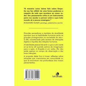 “A maneira como Jaime fala sobre Empatia nos faz refletir de uma forma poderosa a respeito de tudo que acontece ao nosso redor. Seu pensamento crítico é um instrumento para nos ajudar a pensar sobre o que todo mundo vê e poucos enxergam.” ROSSANDRO KLINJEY, psicólogo, palestrante e escritor. Grandes pensadores e cientistas da atualidade apontam que as habilidades humanas serão as grandes protagonistas na sociedade do século XXI, caracterizado pelo excesso de interações digitais e liquidez das relações humanas. A habilidade pessoal de sentir o que o outro sente só se torna útil quando saímos da imaginação para a ação. A Empatia é um verbo. Ela não existe apenas no campo da observação e das boas intenções. A proposta deste livro é trazer reflexões sobre situações que vivenciamos em comunidade ou que se encontram nas profundezas dos nossos pensamentos.