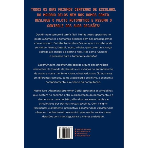 Você já parou para pensar em como nosso cérebro funciona quando precisamos tomar uma decisão? Por trás de todas as nossas decisões existem processos mentais e psicológicos acontecendo, apesar de, frequentemente, fazermos escolhas das quais nem sempre estamos conscientes. As palavras que usamos, os movimentos que fazemos com o corpo, tarefas que cumprimos por hábito, todas são decisões que tomamos sem fazer grandes reflexões. Mas há momentos em que precisamos assumir o controle para tomar decisões fundamentais em nossa vida sem nos perder no processo. Alexandra Strommer Godoi, doutora em Economia de Empresas, palestrante da Casa do Saber e professora da FGV, vem analisando há anos o modo como nós fazemos escolhas em diferentes áreas da vida e o que podemos fazer para tornar o processo de tomada de decisão mais fácil e escolher com mais sabedoria, sem cair em armadilhas inesperadas. Em Escolher bem, escolher mal, a autora apresenta os recursos necessários para não cairmos nessas armadilhas e os estudos que têm sido feitos por especialistas sobre o assunto em áreas como a psicologia cognitiva, a economia comportamental e a ciência da computação. Escolher bem, escolher mal, livro fascinante e informativo no qual você encontrará o conhecimento de que precisa para pensar sobre questões complexas, compreender melhor nossas ações e limitações. Se você está em busca de mais conhecimento e segurança em sua vida, ler este livro, com certeza, é a melhor decisão que poderia tomar.
