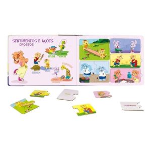 Reunindo temas fundamentais, esta obra desenvolve as habilidades necessárias para construir um fundamento sólido nos conceitos iniciais sobre opostos, por meio da associação e memorização. Com uma abordagem inovadora, a obra contém exemplos de opostos concretos e abstratos (sentimentos e ações), porque o ser humano é um conjunto de racionalidade e emoção e, é assim, que o aprendizado se consolida. Além disso, estimula as habilidades cognitivas, psicomotoras (noção espacial) e a percepção visual, de forma lúdico-didática.