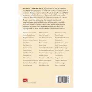 Escrito a várias mãos, Espiritualidade no chão da vida traduz com fidelidade o compromisso de refletir a fé nos mais variados aspectos da existência. Mentores e mentoreados do Projeto Grão de Mostarda (PGM) apresentam reflexões sobre como a fé encarnada possibilita ao cristão relacionar-se com a complexidade da vida e suas demandas mais urgentes. Graças a seucaráter colaborativo, Espiritualidade no chão da vida espelha a riqueza da comunhão do corpo de Cristo, exalta a santidade do Criador e mostra o impacto transformador quando nossos dons são oferecidos ao próximo. Trata-se de uma caminhada para toda a vida, cujo significado vai sendo revelado à medida que descobrimos o outro. Alexandre Brasil Fonseca Andrea Ramos Santos Benjamim Lenz César Christiane Scheuer Caetano Davi Rabelo Davi Ribeiro Lin Everton Kischlat Fabiane Luckow Fabio Tadashi Suzaki Fernanda Kivitz Flavia da Hora Giovanna de Barros E. Amaral Guilherme Ribeiro de Paula Gustavo da Hora Isabelle Ludovico João P. B. Lotufo Jr. José Walter Sales e Silva Karen Aquino Karen Bomilcar Keren Moura Ludhiana E. M. Sales e Silva Luiz Henrique Ramos Santana Marcell Silva Steuernagel Marcos Almeida Marcus Vinicius A. B. de Matos Martina Seefeld Storck Osmar Ludovico Paula Reis Oliveira Rachel Currie Triska Raquel Arouca Ricardo Barbosa de Sousa Rosana Basile Sandro Roberto Caetano Sarah Nigri de Angelis Silêda Silva Steuernagel Sônia Regina C. B. Gertner Soraya Cavalcanti Thais Romano Thiago Crucciti Tiago da Costa Santos Valdir Steuernagel Ziel J. O. Machado