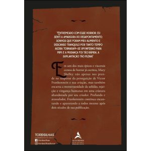 “Entremeado com esse horror, eu senti a amargura do desapontamento; sonhos que foram meu alimento e descanso tranquilo por tanto tempo agora tornaram-se um inferno para mim; e a mudança foi tão rápida, a suplantação tão plena!” Em um dos mais épicos e viscerais contos de horror já escritos, Mary Shelley não apenas nos prende no suspense da perseguição de Victor Frankenstein e sua criação, mas também encarna a monstruosidade da solidão, rejeição e vingança humanas em uma criatura abandonada por seu criador. Profundo e avassalador, Frankenstein continua encantando e apavorando a todos mesmo após dois séculos de sua publicação.