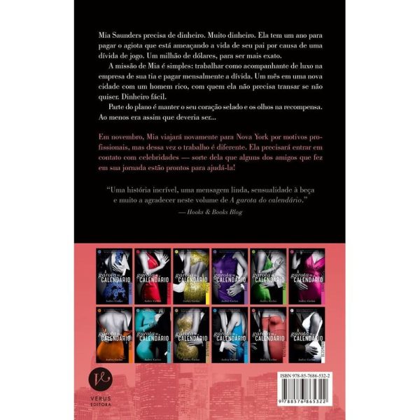 Mia Saunders precisa de dinheiro. Muito dinheiro. Ela tem um ano para pagar o agiota que está ameaçando a vida de seu pai por causa de uma dívida de jogo. Um milhão de dólares, para ser mais exato. A missão de Mia é simples: trabalhar como acompanhante de luxo na empresa de sua tia e pagar mensalmente a dívida. Um mês em uma nova cidade com um homem rico, com quem ela não precisa transar se não quiser? Dinheiro fácil. Parte do plano é manter o seu coração selado e os olhos na recompensa. Ao menos era assim que deveria ser… Em novembro, Mia viajará novamente para Nova York por motivos profissionais, mas dessa vez o trabalho é diferente. Ela precisará entrar em contato com celebridades – sorte dela que alguns dos amigos que fez em sua jornada estão prontos para ajudá-la!