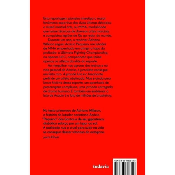 “Na melhor tradição do novo jornalismo, Adriano Wilkson constrói uma história vibrante e dramática, cheia de personagens de carne e osso (e músculos) inesquecíveis, em que o ringue onde as batalhas se desenrolam se torna uma alegoria dos percalços que a vida impõe a milhões de brasileiros. Acácio Pequeno precisa evaporar de seu corpo cerca de três litros de água para ter acesso à luta mais importante de sua carreira. Após uma madrugada insana, no meio de uma dieta quase suicida e sem beber uma gota de água, ele se aproxima perigosamente da morte, mas consegue alcançar o peso regulamentar – vinte quilos abaixo de seu normal — e vencer. A grande luta acompanha um ano na vida de Acácio, dividido entre o sonho de uma carreira como lutador profissional e a realidade de um emprego comum, entre a glória nos torneios e as obrigações de todo pai de família.Até que ponto ele pode arriscar a saúde e sacrificar o futuro da família? Ao longo do caminho, o leitor se depara com as trajetórias reais de outros lutadores e treinadores, todos conectados de alguma forma a Acácio e igualmente empenhados em transformar o destino por meio do MMA. Longe dos holofotes do esporte mais controverso dos últimos anos, esses homens e mulheres superam obstáculos impensáveis para seguir em busca de fama, sucesso e realização pessoal.”