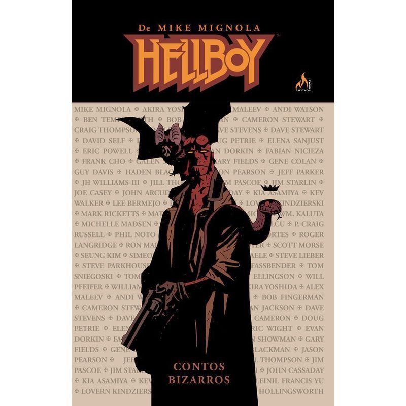 Hellboy contos Bizarros Em 1994, Mike Mignola lançou um projeto autoral muito inusitado e visualmente cativante. Mais de duas décadas após, o protagonista e seu criador desfrutam toda sorte de sucesso possível na indústria da cultura popular. Dos quadrinhos, Hellboy e seus então aliados do Bureau de Pesquisas e Defesa Paranormal já migraram para a literatura, cinema, desenhos animados, brinquedos e jogos eletrônicos. No período em que Mignola precisou se afastar para acompanhar a produção do primeiro longa-metragem de seu personagem, sua ausência foi “compensada” com a antologia especial que a Mythos agora reedita em uma única e sensacional edição. Nas 284 páginas deste volume, alguns dos maiores roteiristas e artistas da nona arte exploram o Universo Hellboy em um genial leque de contos bizarros, levando o mais surreal dos heróis aonde o próprio Mignola ainda não havia ousado ir. “Como vários dos meus colegas ilustradores desejavam produzir aventuras do meu divertido personagem, só posso dizer que essa foi a mais gentil lisonja que poderiam fazer. Quando eu e meu editor começamos a discutir seriamente o projeto, só apresentei uma sugestão: convide pessoas que saibam o que fazem e deixe-as trabalhar à vontade. Simples assim. Eu não queria me envolver em nada, preferia apenas relaxar e curtir os resultados. E curti demais.” – Mike Mignola