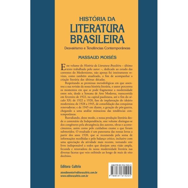 Este volume de Historia da Literatura Brasileira, dedicado ao estudo das correntes do Modernismo, nao apenas foi inteiramente revisto como tambem atualizado, a fim de acompanhar a criacao literaria das ultimas decadas. Massaud Moises percorreu os momento sem que se pode fragmentar a modernidade entre nos, desde a Semana de Arte Moderna ate o fim do seculo XX: de 1922 a 1928, fase de implantacao do ideario modernista; de 1928 a 1945, de consolidacao das conquistas renovadoras; e de 1945 em diante, a geracao do pos-guerra, chegando a uma analise minuciosa das tendencias contemporaneas. O resultado e um panorama das nossas letras a partir dos anos 1920, que se recomenda pela soma de informacoes recolhidas e pelo balanco critico, tornando este livro indispensavel a todos que desejam uma visao ampla, fecunda e renovadora da nossa modernidade literaria nas diversas facetas que veio exibindo ao longo de mais de oito decenios.