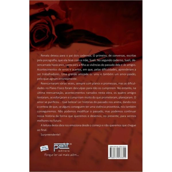 Renata deixou para o pai dois cadernos. O primeiro, de conversas, escritas pela psicografia, que ela teve com a mãe, Sueli. No segundo caderno, Sueli, desencarnada havia anos, conta para a filha as vivências do passado dela e de amigos. Acontecimentos de erros e acertos, em que, pelas dificuldades, aprenderam a ser trabalhadores. Uma grande amizade os uniu e também um amor-paixão, pelo qual agiram erroneamente. Reencarnaram várias vezes, sempre com planos e promessas, mas as dificuldades no Plano Físico foram desculpas para não os cumprirem. No entanto, na última reencarnação, acontecimentos narrados nesta obra, os quatro amigos tentaram, se esforçaram e cumpriram muito do que prometeram, planejaram. O amor se purificou. Que beleza. Ler histórias do passado nos anima, dando-nos a certeza de que, se alguns conseguem ter uma vivência proveitosa, nós também conseguiremos. Não podemos modificar o passado, mas podemos continuar nossa história da forma que queremos e devemos, no presente, para sermos melhores no futuro. A leitura desta obra nos emociona desde o começo e não queremos que chegue ao final. Surpreendente.