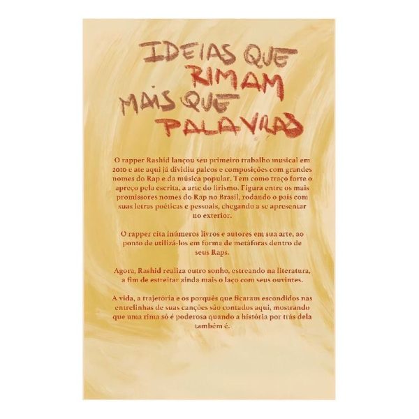 ‘Ideias que rimam mais que palavras – Vol.1’ é o primeiro livro de Rashid, rapper paulistano que cultiva desde a infância o gosto pela leitura e pelo universo literário. Como rimador, é referência de lírica e traz isso, agora, em novo formato, fazendo crônicas de suas músicas enquanto relembra momentos marcantes da carreira. Rashid narra partes de sua trajetória musical, indo dos dias mais precários até os mais expressivos, ao dar detalhes das composições e daquilo que o inspirou a fazer os versos que o tornaram consagrado. O livro cobre o período de 2008 a 2014, enquanto construía uma base sólida de trabalho e abria caminho para os sonhos que escrevia em forma de poesia nos cadernos, seus diários de bordo que ainda têm muito a dizer.