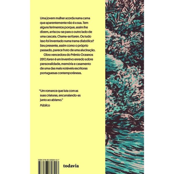 Uma jovem mulher acorda numa cama que aparentemente não é sua. Tem alguns ferimentos porque, assimlhe dizem, arriscou-se para o outro lado de uma cascata. Chama-se Karen. Ou tudo isso foi inventado numa trama diabólica? Seu presente, assim como o próprio passado, parece fruto de uma alucinação. Obra vencedora do Prêmio Oceanos 2017, Karen é um inventido enredo sobre personalidade, memória e casamento de uma das mais notáveis escritoras portuguesas contemporâneas.