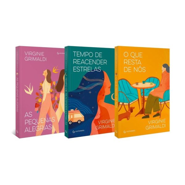 Tempo de reacender estrelas Anna tem 37 anos, está separada do marido e as dívidas não param de aumentar. Ela se desdobra para manter o trabalho como garçonete em um restaurante e sustentar as filhas, Chloé e Lily, com quem encontra apenas no café da manhã. Chloé tem 17 anos. Uma adolescente cheia de sonhos prestes a desistir deles. É por meio de seu blog que vamos conhecendo melhor seus planos e desilusões. Lily, 12 anos, está com problemas na escola e o único a saber disso é Marcel, seu diário, e seu ratinho, batizado com o mesmo nome do pai, Mathias, que abandonou o barco quando ela tinha 5 anos. Quando Anna se dá conta de que suas filhas não estão bem, ela toma uma decisão inesperada: levá-las em um motorhome, rumo aos países da Escandinávia, para ver a Aurora Boreal. Uma história emocionante sobre as relações familiares, os encontros e desencontros de gerações e, acima de tudo, sobre o amor. As pequenas alegrias Virginie Grimaldi, a autora mais lida da França, está de volta com seu novo romance sobre momentos inesquecíveis que mudam nossa vida para sempre. Como nasce uma mãe? E o que sobra para ela depois que os filhos saem de casa? A maternidade tem muitas facetas a serem exploradas, aspectos que afloram nossas melhores (e piores) emoções. Com a proximidade do seu aniversário de 50 anos, Élise precisa aprender a lidar com a solidão. Sua filha mais velha vive em Londres, e o caçula acaba de se mudar para Paris. Como se não bastasse, sua única companhia para enfrentar o ninho vazio é um cachorro desajeitado e um tanto depressivo. Agora, ela deverá encontrar um novo sentido para sua vida e reaprender a não viver em função dos filhos. Em situação oposta está Lili, que ainda não estava pronta para dar à luz uma menininha. Sua filha chegou antes da hora, trazendo consigo todas as angústias e temores que só uma mãe é capaz de sentir: Ela vai resistir? Como existirei sem minha filha? Ela viverá bem? Algum dia nossas vidas voltarão ao normal? Lili ainda busca entender como um ser tão minúsculo pode ocupar tamanho espaço na vida de alguém. Duas histórias, duas versões diferentes da maternidade: a mulher que precisa aprender a ser mãe e a mãe que precisa reaprender a ser mulher. As pequenas alegrias é um romance sensível sobre as ondas de emoções que inundam nossa vida, sobre os pequenos grandes momentos em que tudo ao nosso redor se transforma, sobre os encontros indeléveis que mudam nosso destino para sempre. O que resta de nós Jeanne perdeu o grande amor de sua vida. Aos 74 anos, precisa encarar uma viuvez dolorida. De repente, viu-se sozinha no apartamento com quem compartilhou décadas de um casamento feliz, só ela e Pierre. Em suas visitas diárias ao túmulo do marido, ela compartilha sua solidão e seus medos, inclusive o de não conseguir pagar todas as contas sem o salário dele. Para resolver o problema, ela toma uma decisão impulsiva: alugar um dos quartos do apartamento. Mal sai pelo bairro distribuindo folhetos de divulgação e já consegue dois candidatos: Théo, aprendiz de confeiteiro da padaria ali perto, e Iris, uma jovem cuidadora de idosos e doentes. Théo está ansioso por ter um lugar decente para morar. O carro dentro do qual vivia foi rebocado com todos os seus pertences, e o custo de recuperá-lo é mais alto do que ele pode bancar. Alugar um quarto próximo ao trabalho é a opção perfeita. Iris também está desesperada. Sem aviso prévio, o locatário do apartamento em que morava pediu o imóvel de volta, e ela tem poucos dias para achar um novo teto. Pior: precisa ser o mais discreta possível, para que uma pessoa do seu passado não a encontre. Jeanne segue sua intuição, desocupa o terceiro quarto do apartamento e recebe Théo e Iris para morarem com ela. A princípio indiferentes uns aos outros, a convivência vai despertando sentimentos inesperados, e assim a solidão dos três pouco a pouco transforma completamente a vida de cada um.