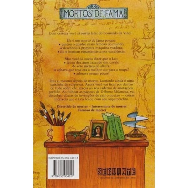 O artista italiano Leonardo da Vinci (1452-1519) é conhecido no mundo inteiro por ter pintado o quadro mais famoso de todos os tempos: a Mona Lisa, o incrível retrato de uma mulher de sorriso enigmático. Ele era um verdadeiro gênio, um homem à frente do seu tempo em matéria de ciência, matemática e engenharia: o Leo imaginou helicópteros, tanques de guerra e submarinos séculos antes que esses inventos se tornassem realidade. Além disso, ele foi também um sábio, precursor da medicina e da filosofia modernas. O Leo não só buscou desvendar os segredos da anatomia, desenhando os mais complicados detalhes do corpo humano, como também se questionou sobre o lugar do homem no Universo e o sentido da existência. Ainda por cima, o Leo era músico, arquiteto, cartógrafo e urbanista (fez vários projetos de cidades, edifícios e aquedutos). Em Leonardo da Vinci e seu supercérebro o leitor vai saber mais coisas inacreditáveis sobre esse homem genial. Por exemplo: – Que ele era lindo de morrer, se vestia superbem, tinha uma saúde de ferro, montava a cavalo e era esgrimista; – Por que ele despejou um balde d’água num padre; – Como quase matou o pai de susto, – Por que fez seu professor de arte desistir da pintura.