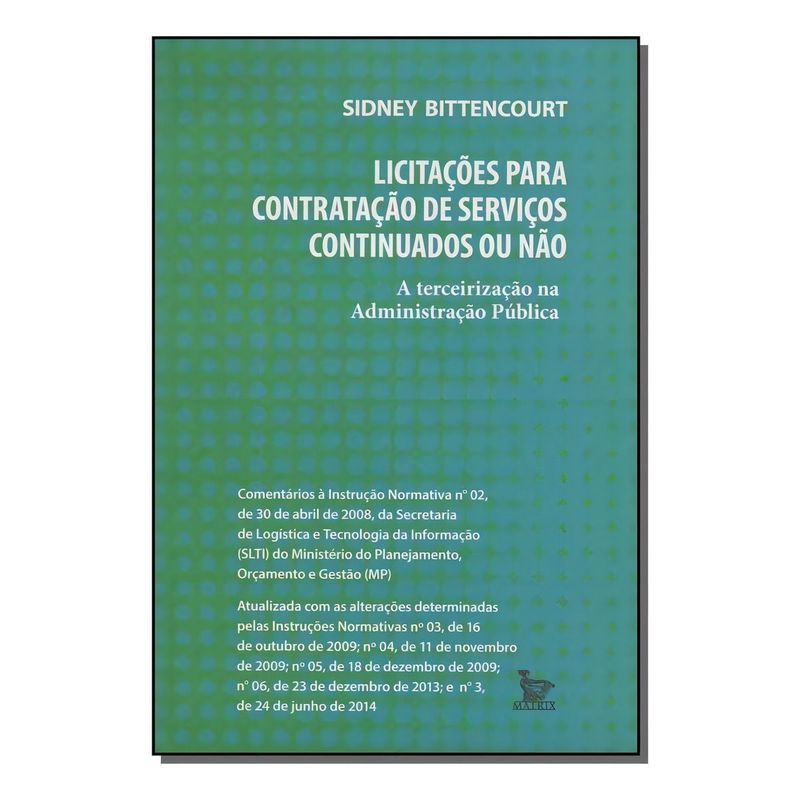 Diante de regra constitucional expressa (art. 37 XXI) e normas legais e infralegais, é inconteste que a terceirização no âmbito da Administração Pública é perfeitamente viável. Todavia, ela só pode ocorrer nas chamadas atividades-meio, dado que as atividades-fim estão reservadas para a execução direta dos agentes públicos. Para disciplinar a matéria, que se materializa por intermédio da contratação de serviços, a Secretaria de Logística e Tecnologia da Informação do Ministério do Planejamento editou a Instrução Normativa nº 02/2008, considerada a mais importante ferramenta para celebração desses tipos de contrato pela Administração Pública Federal. A presente obra, de autoria do Prof. Sidney Bittencourt, busca esclarecer todas as nuances dessa importante questão técnico-jurídica, apresentando ao público leitor comentários a todos os artigos dessa IN.