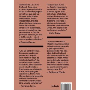 Poucas figuras públicas foram mais brasileiras do que a arquiteta italiana Lina Bo Bardi. Chegando ao Brasil logo após a Segunda Guerra, ela se afeiçoou à cultura brasileira de tal maneira que se tornou uma de suas principais intérpretes, capaz de uma leitura das tradições locais ao mesmo tempo rigorosa e abrangente. Crítico de arquitetura e ensaísta de mão-cheia, Francesco Perrotta-Bosch examina a trajetória dessa artista brilhante à luz da seguinte questão: como uma estrangeira foi capaz de enxergar tanto de um país que não era o seu, a ponto de traduzi-lo para os próprios brasileiros? Para Lina Bo Bardi, tudo poderia ser projetado, da arquitetura às páginas de revistas, de instituições culturais aos cardápios, dos acontecimentos às recordações. Tudo ela quis decidir — até mesmo seu país. Lina tinha horror à oficialidade e aos ritos sociais da vida burguesa. Foi comunista, teve papel importante no combate ao regime militar, mas era também a senhora de uma majestosa casa modernista no Morumbi e esposa de Pietro Maria Bardi, o todo-poderoso escolhido por Assis Chateaubriand para criar e gerir o Museu de Arte de São Paulo. Com base em pesquisa extensa, minucioso levantamento de fontes inéditas, calcado em dezenas de entrevistas, bibliografia brasileira e italiana, mas sobretudo narrado com leveza e numa estrutura temporal engenhosa, este livro leva ao limite as possibilidades do gênero biográfico. Como a obra de Lina, é denso, alegre e sedutor.