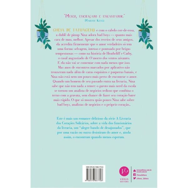 Novo romance da série A Livraria dos Corações Solitários, sobre a vida dos funcionários da livraria que por uma razão ou outra desistiram do amor e, ainda assim, o encontram quando menos esperam. Cheia de tatuagens e com o cabelo cor-de-rosa, a dublê de pinup Nina adora bad boys – quanto mais cara de mau, melhor. Apesar dos receios de seus amigos, ela acredita firmemente que o amor verdadeiro só tem uma forma: selvagem, intenso e pontuado por brigas tempestuosas – como na história de Heathcliff e Cathy, o casal angustiado de O morro dos ventos uivantes. E ela não vai se contentar com nada menos que isso. Mas anos de encontros marcados por aplicativo não trouxeram nada além de caras esquisitos e paqueras banais, e Nina não está nem um pouco mais perto de encontrar o amor. Quando um homem de seu passado entra na livraria, Nina sabe que não tem nada a temer: o garoto mais nerd da escola se tornou um analista de negócios tedioso que combina o terno com a gravata, sem chance de fazer seu coração bater mais rápido. O que só mostra quão pouco Nina sabe sobre bad boys, analistas de negócios e o próprio coração…