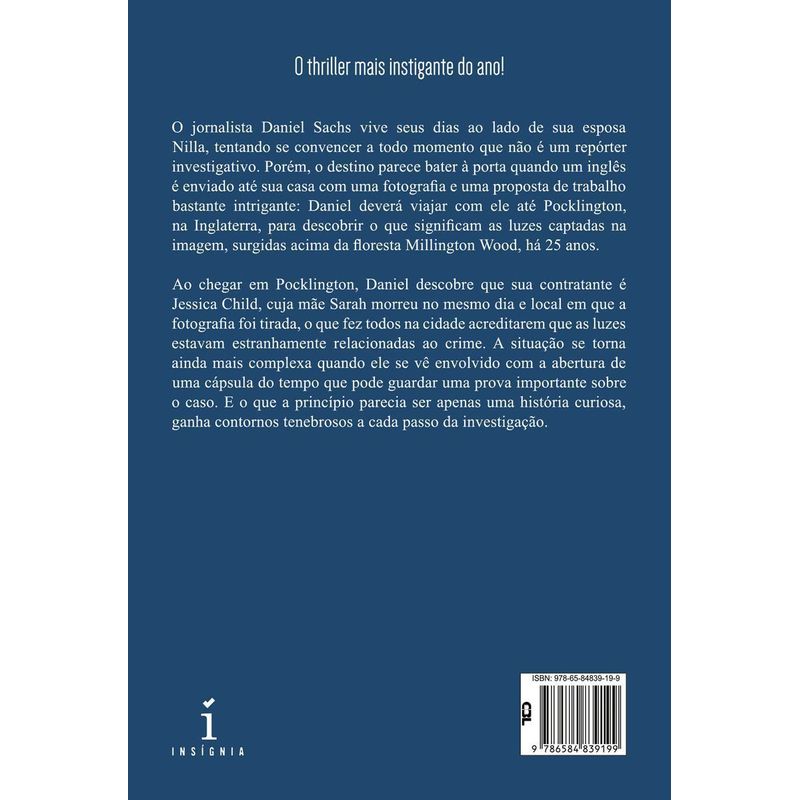 O jornalista Daniel Sachs vive seus dias ao lado de sua esposa Nilla, tentando se convencer a todo momento que não é um repórter investigativo. Porém, o destino parece bater à porta quando um inglês é enviado até sua casa com uma fotografia e uma proposta de trabalho bastante intrigante: Daniel deverá viajar com ele até Pocklington, na Inglaterra, para descobrir o que significam as luzes capturadas na imagem, surgidas acima da floresta Millington Wood, há 25 anos. Ao chegar em Pocklington, Daniel descobre que sua contratante é Jessica Child, cuja mãe Sarah morreu no mesmo dia e local em que a fotografia foi tirada, o que fez com que todos na cidade acreditassem que as luzes estiveram estranhamente relacionadas ao crime. A situação se torna ainda mais complexa quando ele se vê envolvido com a abertura de uma cápsula do tempo que pode guardar uma prova importante sobre o caso. E o que a princípio parecia ser apenas uma história curiosa, ganha contornos tenebrosos a cada passo da investigação. Após o premiado romance Ponto Cego, Felipe Colbert consegue construir uma nova trama envolvente, repleta de suspense e reviravoltas, e nos apresenta a aventura mais difícil da vida do repórter Daniel Sachs em um cenário verossímil e desafiador, típico dos melhores thrillers do mundo.