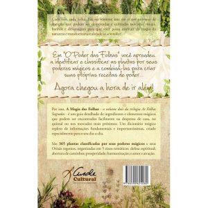 Em “O Poder das Folhas” – volume 1 da Trilogia Folhas Sagradas – você aprendeu a identificar e classificar as plantas por suas características mágicas e também aprendeu a combiná-las para criar suas próprias receitas de poder… Agora chegou a hora de dar um passo adiante! Cada raiz, cada folha, flor ou semente traz em si um universo de energias que podem ser despertadas e utilizadas nos seus rituais, banhos e defumações para que você possa usufruir da magia da natureza e transformar a realidade ao seu redor! Por isso, A Magia das Folhas – o volume dois da trilogia – é o maior dicionário de ervas mágicas do país: um guia detalhado de ingredientes e elementos mágicos que podem ser encontrados facilmente na despensa de casa, no quintal ou nos mercados mais próximos. Um guia de estudos e referências, repleto de informações fundamentais e importantíssimas, criado especialmente para o seu dia-a-dia. São 365 plantas classificadas por seus poderes mágicos e seus Orixás regentes, organizadas em 5 eixos temáticos: limpeza, defesa e descarrego espiritual; abertura de caminhos; prosperidade; harmonização; e amor e atração.