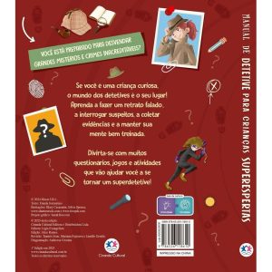 Se você é uma criança curiosa, o mundo dos detetives é o seu lugar! Aprenda a fazer um retrato falado, interrogar suspeitos, a coletar evidências e a manter sua mente bem treinada. Divirta-se com muitos questionários, jogos e atividades que vão ajudar você a se tornar um superdetetive.