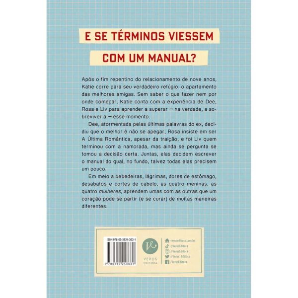 E se términos viessem com um manual? O Manual do coração partido tem todos os passos de quem já precisou, precisa ou precisará superar o ex. Após o fim repentino do relacionamento de nove anos, Katie corre para seu verdadeiro refúgio: o apartamento das melhores amigas. Sem saber o que fazer nem por onde começar, Katie conta com a experiência de Dee, Rosa e Liv para aprender a superar, na verdade, a sobreviver a esse momento. Dee, atormentada pelas últimas palavras do ex, decidiu que o melhor é não se apegar; Rosa insiste em ser A Última Romântica, apesar da traição; e foi Liv quem terminou com a namorada, mas ainda se pergunta se tomou a decisão certa. Juntas, elas decidem escrever o manual do qual, no fundo, talvez todas elas precisem um pouco. Em meio a bebedeiras, lágrimas, dores de estômago, desabafos e cortes de cabelo, as quatro meninas, as quatro mulheres, aprendem umas com as outras que um coração pode se partir (e se curar) de muitas maneiras diferentes.