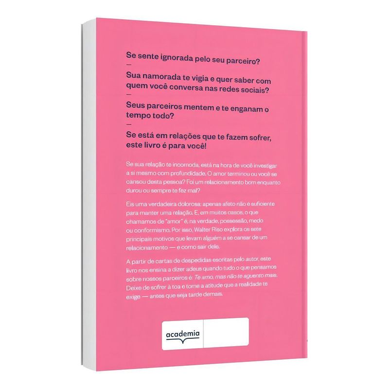 Se está em relações que te fazem sofrer, este livro é para você! Se sua relação te incomoda, está na hora de você investigar a si mesmo com profundidade. O amor terminou ou você se cansou desta pessoa? Foi um relacionamento bom enquanto durou ou sempre te fez mal? Eis uma verdadeira dolorosa: apenas afeto não é suficiente para manter uma relação. E, em muitos casos, o que chamamos de “amor” é, na verdade, possessão, medo ou conformismo. Por isso, Walter Riso explora os sete principais motivos que levam alguém a se cansar de um relacionamento – e como sair dele. A partir de cartas de despedidas escritas pelo autor, este livro nos ensina a dizer adeus quando tudo o que pensamos sobre nossos parceiros é: Te amo, mas não te aguento mais. Deixe de sofrer à toa e tome a atitude que a realidade te exige – antes que seja tarde demais.