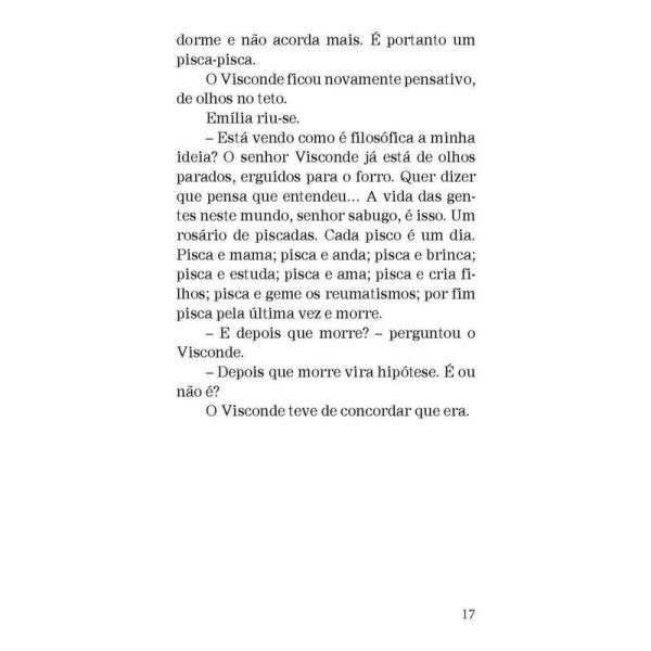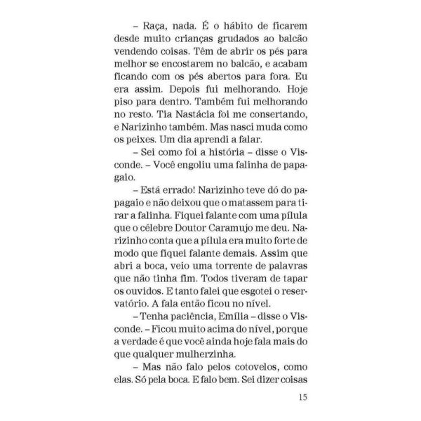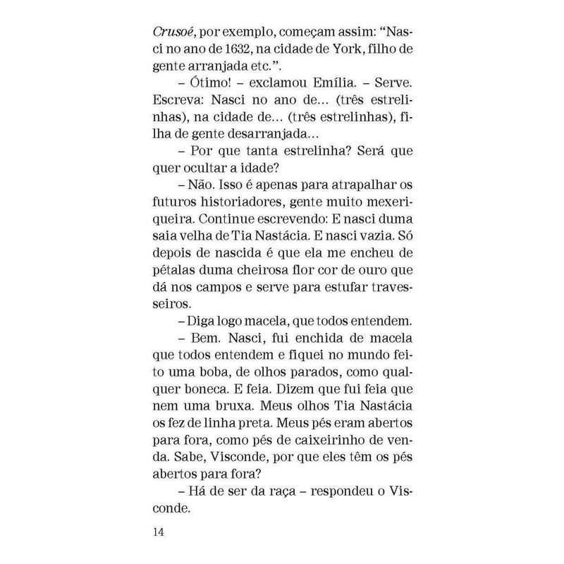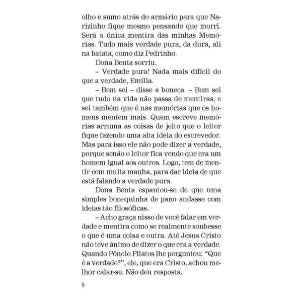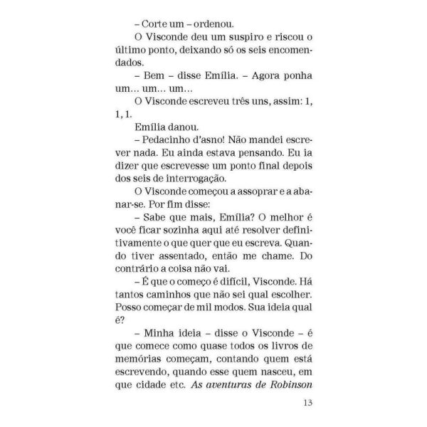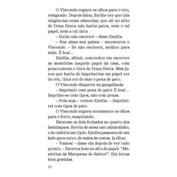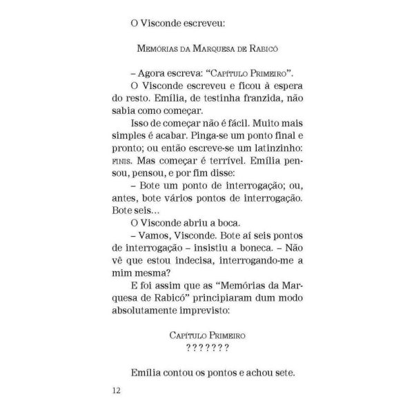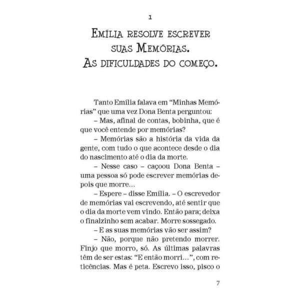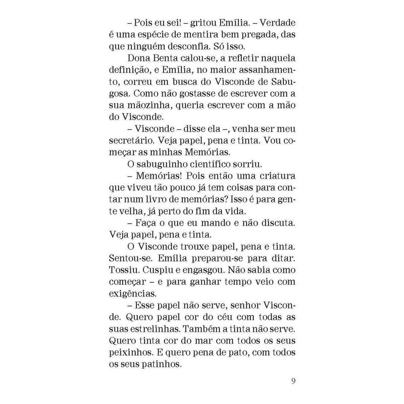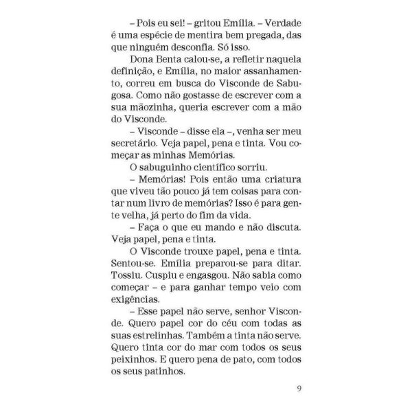 “Memórias imaginadas “– Emília! – exclamou Dona Benta. – Você quer nos tapear. Em memórias a gente só conta a verdade, o que houve, o que se passou. Você nunca esteve em Hollywood […]. Como então se põe a inventar tudo isso? – Minhas Memórias – explicou Emília – são diferentes de todas as outras. Eu conto o que houve e o que devia haver. – Então é romance, é fantasia… – São memórias fantásticas. Quer ler um pedacinho?” Neste livro curioso e cheio de travessuras, Emília escreve suas memórias – com uma ajudinha do Visconde de Sabugosa. Me¬mórias como nunca se viu, em que ela conta não só sua vida, mas sobretudo suas aventuras no Sítio do Picapau Amarelo – as vividas e, principalmente, as imaginadas. Esta história, de 1936, Monteiro Lobato dedica à sua genial criação: a marota Emília, a boneca mais célebre da literatura do mundo todo, de todos os tempos.”