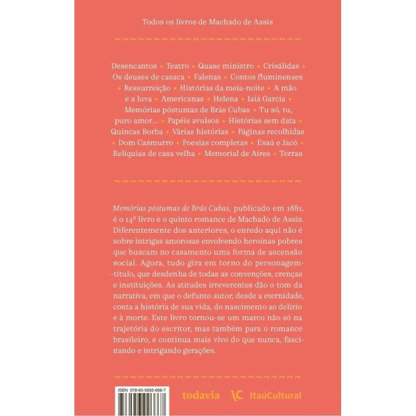 É o 14º livro e o quinto romance de Machado de Assis. Diferentemente dos anteriores, o enredo não se concentra em heroínas pobres que buscam no casamento uma forma de ascensão social. Agora, quase tudo gira em torno do personagem-título, que desdenha de todas as convenções, crenças e instituições. As atitudes irreverentes dão o tom da narrativa, em que o defunto autor, desde a eternidade, conta a história de sua vida, do nascimento ao delírio e à morte. Essa obra tornou-se um marco não só na trajetória do escritor, mas também para o romance brasileiro, e continua mais viva do que nunca, fascinando e intrigando gerações.