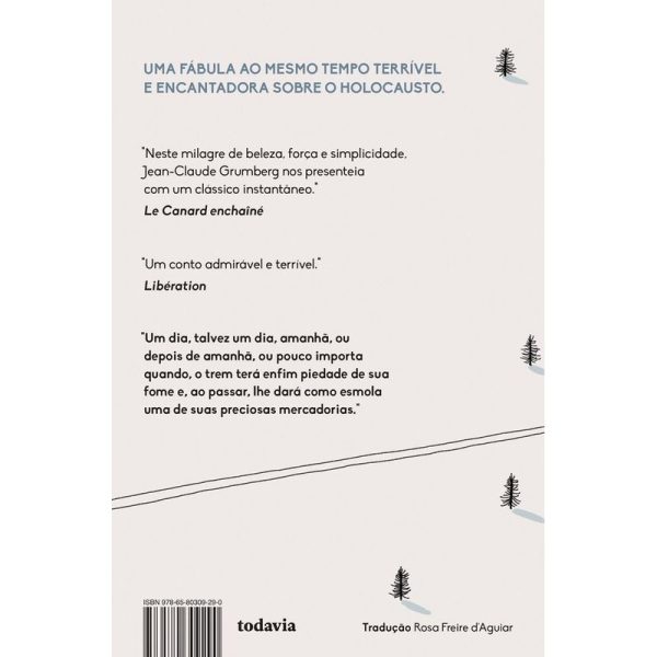 Um casal de lenhadores observa, diariamente, comboios atulhados de gente passarem diante de seus olhos. Ingênua, a mulher sempre espera por um aceno ou mesmo um presente. Para onde vão essas pessoas?, ela se pergunta. Até que alguém joga o presente que ela jamais pensou receber: um bebê. Neste breve relato, o autor, à maneira das fábulas, fala de um dos capítulos mais tenebrosos da história da humanidade: a deportação de milhões de judeus para os campos de concentração nazistas.
