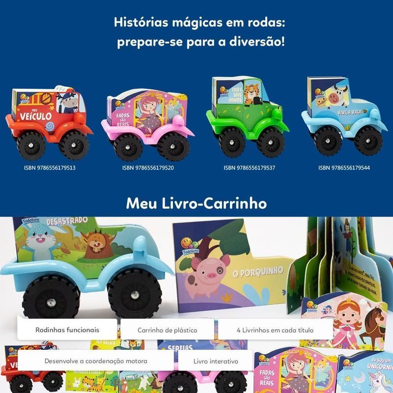Prepare-se para aprender e brincar ao mesmo tempo com Meu Livro-carrinho! Dividido em 4 partes, ele está repleto de histórias divertidas e diferenciadas.