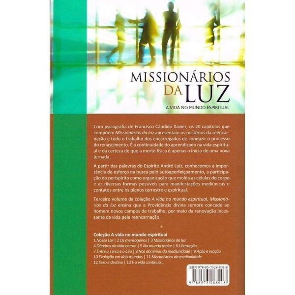 Com psicografia de Francisco Cândido Xavier, os 20 capítulos que compõem Missionários da luz apresentam os mistérios da reencarnação e todo o trabalho dos encarregados de conduzir o processo do renascimento. É a continuidade do aprendizado na vida espiritual e da certeza de que a morte física é apenas o início de uma nova jornada. A partir das palavras do Espírito André Luiz, conhecemos a importância do esforço na busca pelo autoaperfeiçoamento, a participação do perispírito como organização que molda as células do corpo e as diversas formas possíveis para manifestações mediúnicas e contatos entre os planos terrestre e espiritual.