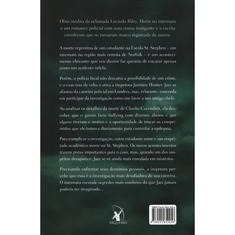 Obra inédita da aclamada Lucinda Riley, Morte no internato é um romance policial com uma trama instigante e a escrita envolvente que se tornaram marca registrada da autora. Lucinda é autora da série As Sete Irmãs, um fenômeno global com mais de 25 milhões de exemplares vendidos. A morte repentina de um estudante na Escola St. Stephen – um internato na região mais remota de Norfolk – é um acontecimento chocante que seu diretor faz questão de encarar apenas como um acidente infeliz. Porém, a polícia local não descarta a possibilidade de um crime, e o caso traz de volta à ativa a inspetora Jazmine Hunter. Jazz se afastou da carreira policial em Londres, mas, relutante, concorda em participar da investigação como um favor a seu antigo chefe. Ao analisar os detalhes da morte de Charlie Cavendish, ela descobre que o garoto fazia bullying com diversos alunos e que alguns tiveram o motivo e a oportunidade de trocar os comprimidos que ele tomava diariamente para controlar a epilepsia. Para complicar a investigação, outro estudante some e um respeitado acadêmico morre na St. Stephen. Os novos acontecimentos trazem pistas importantes para o caso, mas, quando um dos suspeitos desaparece, Jazz se vê ainda mais enredada em mistérios. Precisando enfrentar seus demônios pessoais, a inspetora percebe que aquela investigação é a mais desafiadora de sua carreira. O internato esconde segredos mais sombrios do que Jazz jamais poderia ter imaginado…