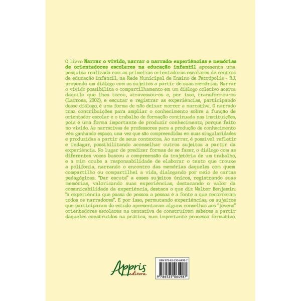 O livro EXPERIÊNCIAS E MEMÓRIAS DE ORIENTADORES ESCOLARES NA EDUCAÇÃO INFANTIL: NARRATIVAS EM DIÁLOGO apresenta uma pesquisa realizada com as primeiras orientadoras escolares de centros de educação infantil, na Rede Municipal de Ensino de Petrópolis – RJ, propondo um diálogo com os sujeitos a partir de suas memórias. Narrar o vivido possibilita o compartilhamento em um diálogo coletivo acerca daquilo que lhes tocou, atravessou-os e, por isso, transformou-os (Larrosa, 2002), e escutar e registrar as experiências, participando desse diálogo, é uma forma de não deixar morrer a narrativa. O narrado traz contribuições para ampliar o conhecimento sobre a função de orientador escolar e o trabalho de formação continuada nas instituições, pois é uma forma importante de produzir conhecimento, porque feito no vivido. As narrativas de professores para a produção de conhecimento vêm ganhando espaço, uma vez que são compreendidas em suas singularidades e produzidas a partir de seus contextos. Ao narrar, é possível refletir e indagar, possibilitando aconselhar outros sujeitos a partir da experiência. No lugar de predizer formas de se fazer, o diálogo com as diferentes vozes buscou a compreensão da trajetória de um trabalho, e a mim coube a responsabilidade de elaborar o texto que trouxe a polifonia, narrando o encontro das memórias daqueles com quem compartilho ou compartilhei a vida, dialogando por meio de cartas pedagógicas. “Dar escuta” a esses sujeitos únicos, registrando suas memórias, valorizando suas experiências, destacando o valor da comunicabilidade da experiência, destaca o que diz Walter Benjamin: “a experiência que passa de pessoa a pessoa é a fonte a que recorreram todos os narradores”. E por isso, permutando experiências, os sujeitos que participaram do estudo apresentaram alguns conselhos aos “jovens” orientadores escolares na tentativa de construírem saberes a partir daqueles construídos na prática, num importante processo formativo.