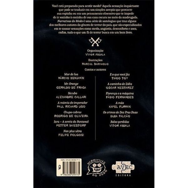 Você está preparado para sentir medo? Aquela sensação inquietante que pode se traduzir em um simples arrepio que percorre sua espinha ou em um pensamento obsessivo que te impede de ir sozinho à cozinha de sua casa escura no meio da madrugada. Narrativas do Medo é uma série de antologias que traz alguns dos melhores autores do gênero de terror do país, que são especializados em te causar sensações como medo, angústia, desconforto e asco, enfim, tudo o que um fã de terror busca em um bom livro. Autores e contos: ALEXANDRE CALLARI – Súcubo DUDA FALCÃO – Os crimes de Dez Pras Duas FÁBIO FERNANDES – Florença e a máquina FELIPE FOLGOSI – Non plus ultra GERALDO DE FRAGA – Mr. Orange KAPEL FURMAN – A mão MÁRCIO BENJAMIN – Mar de lua OSCAR NESTAREZ – A Caminho de Lídia PAUL RICHARD UGO – A Múmia do Imperador PETTER BAIESTORF – Iara – A sereia do Pantanal RODRIGO DE OLIVEIRA – Chupa-cabras TIAGO TOY – E o que você fez? VITOR ABDALA – Balas perdidas