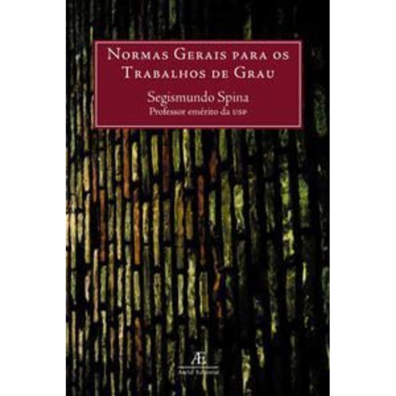 Segismundo Spina responde a uma questão que atormenta muitos estudantes de pós-graduação: qual é, afinal, o método do trabalho acadêmico? Normas Gerais para os Trabalhos de Grau esclarece aspectos fundamentais do fazer científico e apresenta ao pesquisador maneiras de planejar seu trabalho intelectual. Traz orientações sobre todas as fases da investigação, da escolha do tema à organização dos dados coletados. Constitui, assim, guia indispensável à formação dos futuros mestres e doutores.