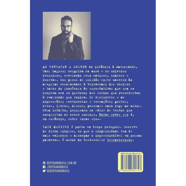 Ao retratar a mulher da infância à maturidade, Zack Magiezi mergulha no universo e na aura femininos revelando suas nuances, facetas e matizes. Dos picos de solidão noite adentro às alegrias ensolaradas à beira-mar; dos cheiros e tatos da inocência às expectativas que ora se cumprem ora se quebram; dos sonhos que reconfortam à realidade que lapida. Os vislumbres e as impressões; sentimentos e sensações; gestos, fotos, livros, discos, pessoas: nada foge ao autor. Obra inédita inspirada na série de textos que conquistou as s sociais, Notas sobre ela é, em essência, sobre todas elas.