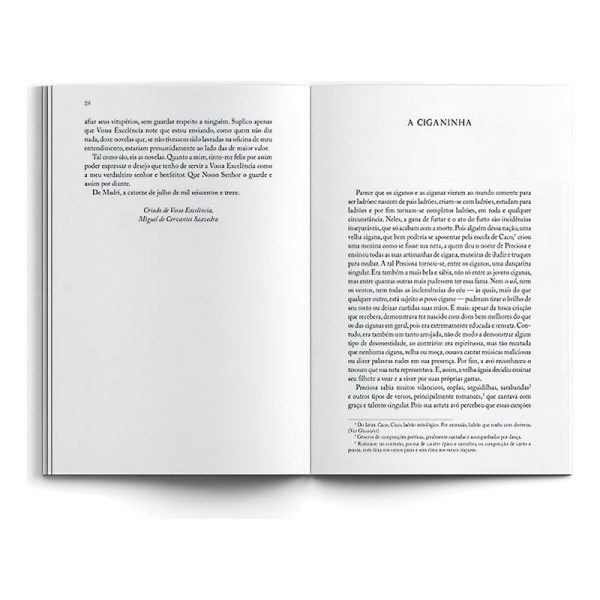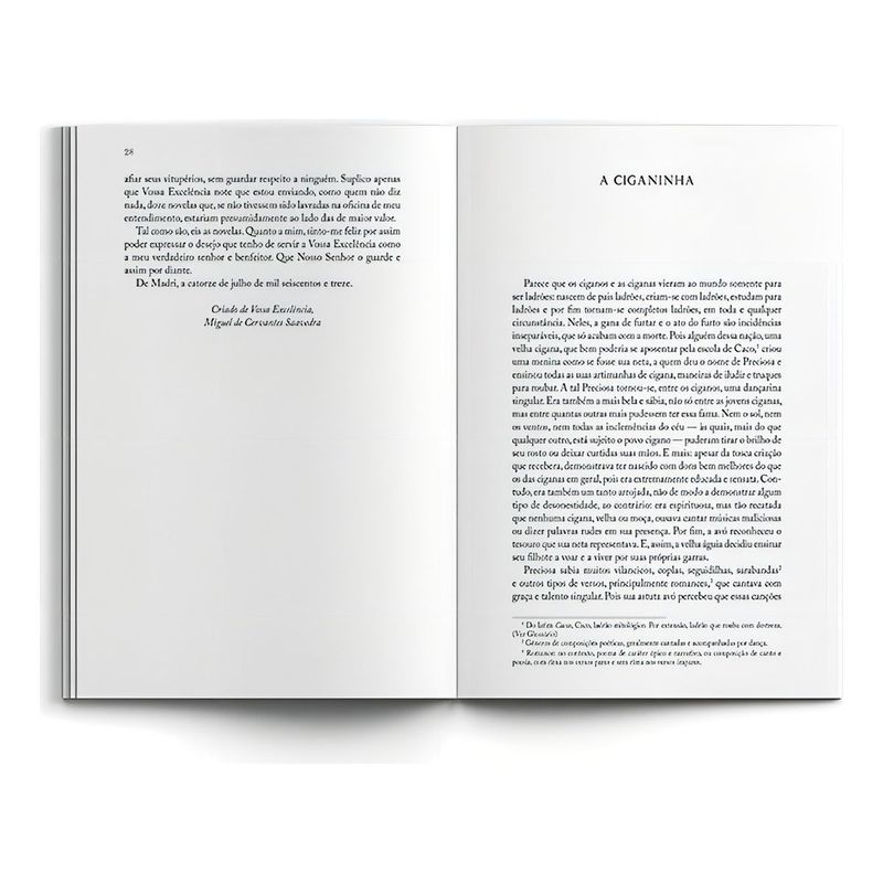 Querido leitor, ao ler estas novelas você estará entrando em outro tempo, no famoso Século de Ouro da literatura espanhola, que nos ofereceu parte do cânone ocidental. Grandes clássicos saíram da pena de autores como Góngora, Quevedo, Calderón, Lope de Vega, e o autor destas Novelas Exemplares, Miguel de Cervantes. O volume contém as seguintes novelas: “A Ciganinha”, “O Amante Generoso”, “Rinconete e Cortadillo”, “A Espanhola Inglesa”, “O Licenciado de Vidro”, “A Força do Sangue”, “O Estremenho Ciumento”, “A Ilustre Fregona”, “As Duas Donzelas”, “A Senhora Cornélia”, “O Casamento Enganoso”, “O Colóquio dos Cães”.