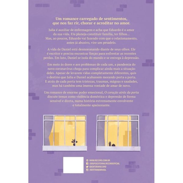 O coração atrás da porta, de Bianca Briones — autora da série Batidas perdidas e da duologia Sonhos de Avalon — é um romance carregado de sentimentos, que nos faz rir, chorar e ter esperança no amor. Julia é auxiliar de enfermagem e acha que Eduardo é o amor da sua vida. Ela planeja constituir uma família, ter filhos… Mas, ao poucos, Eduardo vai fazendo com que o relacionamento, antes já abusivo, vire um pesadelo. A vida de Daniel está desmoronando diante de seus olhos. Ele é escritor e precisa encontrar forças para enfrentar as recentes perdas. Em luto, Daniel se isola do mundo e se entrega à depressão. Em meio às dores e aos problemas de cada um, a pandemia do novo coronavírus chega para complicar ainda mais a situação deles. Apesar de levarem vidas completamente diferentes, quis o destino que Julia e Daniel acabassem morando porta a porta. E atrás de cada porta tem tristezas, traumas, mágoas e saudades, mas há também uma imensa vontade de amar de novo. Um romance de enorme poder emocional, O coração atrás da porta discute temas como violência doméstica e depressão de forma sensível e direta, numa história extremamente envolvente e totalmente apaixonante. “Responsabilidade e respeito. Essas duas palavras definem a abordagem de Bianca a temas tão importantes que compõem esta história. O coração atrás da porta é um livro poderoso, que emociona do início ao fim; enche nosso coração de esperança de tempos melhores.” – Angélica Lima @afliima “Emocionante e intenso. Mais uma vez, Bianca Briones traz assuntos sérios e muito importantes de forma exemplar. Falando sobre amor, união e esperança, Daniel e Julia nos ensinam que, até nos piores momentos, não estamos sozinhos. Basta saber que sempre encontraremos um ‘coração atrás da porta’.” – Mel Troti @meltroti “Bianca Briones arrebatou meu coração mais uma vez. Já perdi as contas de quantas lágrimas derramei ao ler O coração atrás da porta. A história de Julia e Daniel nos mostra que a vida tem suas dores, mas que a cura existe, basta abrir o coração para recebê-la. Este é o tipo de livro que ficará guardado em sua memória e no seu coração!” – Mara Santos @cadernodeumapsiciana “O coração atrás da porta é dolorosamente real, do tipo que nos machuca e marca, mas que também nos transforma e cura. É como uma dose de esperança que mostra o quanto amar (tanto o outro, quanto a si próprio) vale a pena! Sem dúvida, é uma história que permanecerá nos corações dos leitores mesmo depois do fim.” – Alessandra Salvia @estantedaale