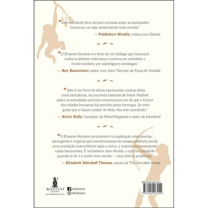 A história épica e insuperável, uma “realização intelectual notável” que descreve como a sociedade humana se desenvolveu de pequenas comunidades de chimpanzés para as extensas civilizações de uma espécie que domina o mundo. Se um chimpanzé se aventura no território de um grupo desconhecido, quase certamente será morto. Mas um nova-iorquino pode viajar para Los Angeles — ou Bornéu — sem nenhum temor. Os psicólogos pouco fizeram para explicar esse fato: durante anos, eles defenderam que nossa biologia coloca um rígido limite superior — cerca de 150 pessoas — no tamanho de nossos grupos sociais. Mas as sociedades humanas são muito maiores. Como conseguimos conviver uns com os outros? Neste livro que destrói paradigmas, o biólogo Mark W. Moffett se baseia em descobertas da psicologia, da sociologia e da antropologia para explicar as adaptações que unem as sociedades. O Enxame Humano revela como a humanidade criou vastas civilizações de complexidade sem igual, e do que precisamos para sustentá-las. Biólogo tropical e pesquisador associado do Instituto Smithsonian, e professor visitante no Departamento de Biologia Evolutiva Humana da Universidade de Harvard. Ele estuda a ecologia das copas das florestas tropicais e o comportamento social dos animais (especialmente formigas) e dos seres humanos. Ele também é autor de vários livros de ciência populares e é conhecido por sua macrofotografia documentando a biologia das formigas. Chamado de “ousado ecoaventureiro” por Margaret Atwood e vencedor da Medalha Lowell Thomas por exploração, seus artigos apareceram em The Best American Science e em Nature Writing e foi convidado para The Colbert Report; Conan; Fresh Air, da NPR; e Sunday Morning, da CBS. Este é o seu quarto livro.