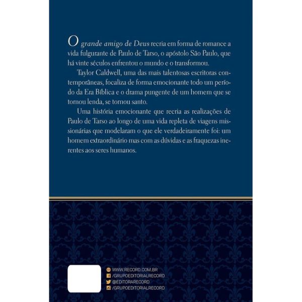 “Nova edição de um clássico de Taylor Caldwell que retrata a vida de São Paulo. Taylor Caldwell dedicou anos de estudo intenso para escrever O grande amigo de Deus, um romance sobre um dos mais apaixonados, inteligentes e dedicados apóstolos do cristianismo primitivo, Saul de Tarshish, ou, como os romanos o chamavam, Paulo de Tarso, o intelectual, advogado e teólogo fariseu, conhecido como Apóstolo dos Gentios. Paulo exerceu mais influência no mundo ocidental e na cristandade do que a maioria de nós conhece, pois o cristianismo, que ele diligentemente espalhou pelo mundo, é o alicerce da jurisprudência, da moral e da filosofia modernas do Ocidente. Graças a seu vigor espiritual e mental, seu esforço e sua justiça, ele criou uma nova sociedade e fomentou a causa da liberdade, amplamente disseminadas nos últimos dois mil anos. Neste livro Taylor Caldwell expõe mais o que São Paulo foi – um homem comum, com os próprios desesperos, com suas angústias, dúvidas, raivas e intolerâncias – e enfatiza menos o que ele fez. Várias obras enfocam apenas o apóstolo, mas, em O grande amigo de Deus, a autora se preocupou com a individualidade de Paulo de Tarso, como ser humano e como santo, aliada a tudo aquilo que o influenciou como cidadão e advogado romano, e como judeu fariseu de grande sabedoria, inteligência e fé duradoura. Taylor Caldwell recria em forma de romance a vida fulgurante de Paulo de Tarso, o apóstolo São Paulo, que há vinte séculos enfrentou o mundo e o transformou. Taylor Caldwell, uma das mais talentosas escritoras contemporâneas, consegue retratar de forma emocionante todo um período da Era Bíblica e o drama pungente de um homem que se tornou lenda, se tornou santo. O grande amigo de Deus é uma história emocionante que recria as realizações de Paulo de Tarso ao longo de uma vida repleta de viagens missionárias que modelaram o que ele verdadeiramente foi: um homem extraordinário, mas com as dúvidas e as fraquezas inerentes aos seres humanos.”