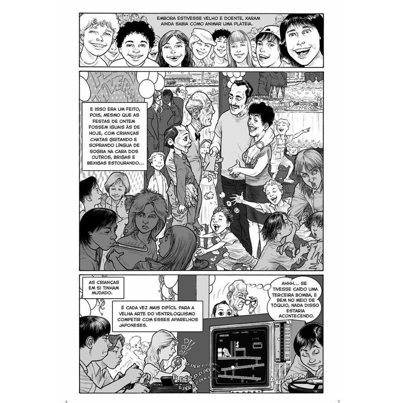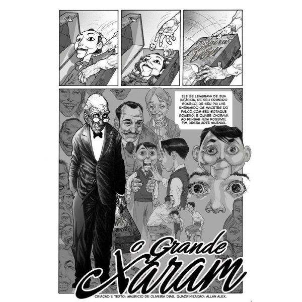 “Excelente. Lembra as histórias de Corben e Dubay na antiga revista Kripta.” – Mike Deodato Jr. Guardião de uma arte esquecida, o velho ventríloquo Xaram anima festas infantis com seu boneco Frodo, obrigado a competir com a popularidade dos jogos eletrônicos. Mas nem sempre as coisas foram assim: no fim dos anos 1940, auge dos programas de rádio, Xaram já teve seu momento de fama. Já no outono de seus anos, o artista sofre com o vazio deixado por um grande afeto que ficou no passado. Do roteirista Mauricio Oira Dias e do ilustrador Allan Alex, O Grande Xaram é uma história emocionante, que resume em poucas páginas a trajetória de toda uma vida. O livro conta ainda com um posfácio do historiador e jornalista Daniel Salomão Roque sobre a história do ventriloquismo.