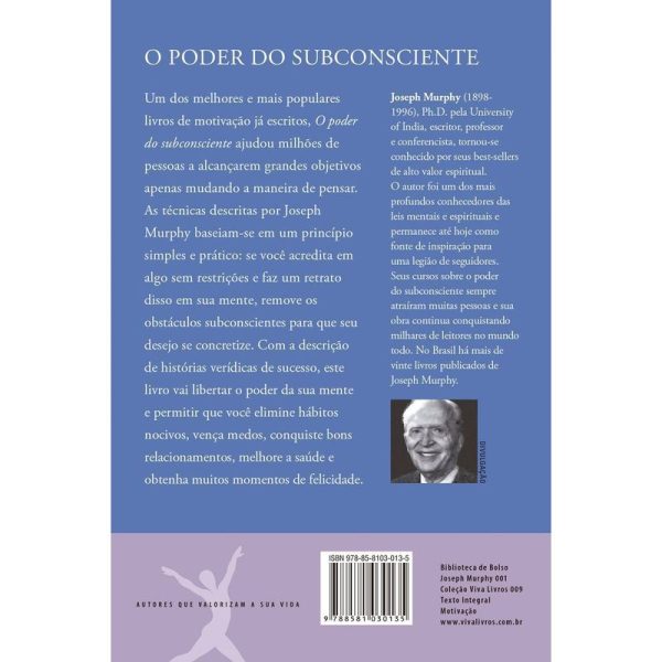 “A edição de bolso de um dos melhores e mais populares livros de autoajuda já escritos. O poder do subconsciente lhe ensinará técnicas para desenvolver todo o potencial da sua mente, superando adversidades, alcançando seus objetivos e mudando situações aparentemente irreversíveis. O poder do subconsciente ajudou milhões de pessoas a alcançarem grandes objetivos apenas mudando a maneira de pensar. As técnicas revolucionárias descritas pelo Dr. Murphy baseiam-se em um princípio simples e prático: se você acredita em algo sem restrições e faz um retrato disso em sua mente, remove os obstáculos subconscientes para que seu desejo se concretize. Assim, qualquer um pode transformar em realidade aquilo em que acredita. Com a descrição de histórias verídicas de sucesso, O poder do subconsciente é um guia para libertar o poder da mente que revela os segredos para melhorar um casamento, vencer medos, eliminar hábitos nocivos, curar pequenos problemas de saúde e obter promoções, prestígio, dinheiro e felicidade pessoal. Este livro é um clássico que já ultrapassou a marca de 1 milhão de exemplares vendidos no Brasil, mudando muitas vidas. “