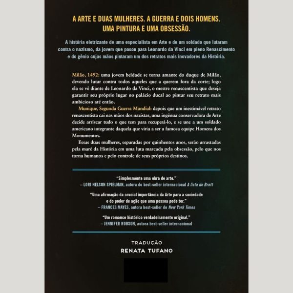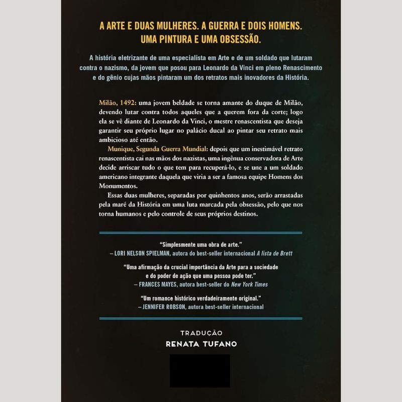 A arte e duas mulheres. A guerra e dois homens. Uma pintura e uma obsessão. Best-seller do USA Today A história eletrizante de uma especialista em Arte e de um soldado que lutaram contra o nazismo, da jovem que posou para Leonardo da Vinci em pleno Renascimento e do gênio cujas mãos pintaram um dos retratos mais inovadores da História. *** Milão, 1492: uma jovem beldade se torna amante do duque de Milão, devendo lutar contra todos aqueles que a querem fora da corte; logo ela se vê diante de Leonardo da Vinci, o mestre renascentista que deseja garantir seu próprio lugar no palácio ducal ao pintar seu retrato mais ambicioso até então. Munique, Segunda Guerra Mundial: depois de deixar cair um inestimável retrato renascentista nas mãos dos nazistas, uma ingênua conservadora de Arte decide arriscar tudo o que tem para recuperá-lo, e se une a um soldado americano integrante daquela que viria a ser a famosa equipe Homens dos Monumentos. Essas duas mulheres, separadas por quinhentos anos, serão arrastadas pela maré da História em uma luta marcada pela obsessão, pelo que nos torna humanos e pelo controle de seus próprios destinos. *** Nesta emocionante ficção histórica inspirada em acontecimentos reais, a criação de uma das pinturas mais famosas de Leonardo da Vinci se entrelaça com a luta de uma mulher para, séculos depois, salvar o quadro dos nazistas durante a Segunda Guerra Mundial. *** “Simplesmente uma obra de arte.” – LORI NELSON SPIELMAN, autora do best-seller internacional “A lista de Brett” “Uma afirmação da crucial importância da Arte para a sociedade e do poder de ação que uma pessoa pode ter.” – FRANCES MAYES, autora best-seller do New York Times “Um romance histórico verdadeiramente original.” – JENNIFER ROBSON, autora best-seller internacional *** Cecilia e Edith são duas mulheres separadas por quinhentos anos. Uma é destemida, e não aceitará ser definida pelos outros, desafiando o mundo em que vive. A outra é conservadora de Arte, apaixonada pelo que faz e por sua família, vivendo na Alemanha nazista. Apesar de serem e viverem momentos tão diferentes, o que as une é uma das grandes pinturas feitas pelo mestre renascentista Leonardo da Vinci: Cecilia por ser a jovem beldade retratada pelo polímata em “Dama com arminho”; e Edith por se ver obrigada a trabalhar para o regime de Adolf Hitler em plena Segunda Guerra Mundial, à procura de tesouros como o quadro. E assim as maquinações por trás da pintura de um retrato sem precedentes na história da Arte são urdidas pela luta frenética para salvá-lo, anos mais tarde, da escuridão imposta pelo nazismo à humanidade. No centro desse retrato, não está apenas uma dama com um arminho, e sim o destino de mulheres, homens e até nações. Um livro brilhantemente escrito, fruto de extensas pesquisas da autora, “O retrato na escuridão” é uma história de bravura e amor, de esperança e redenção. É um livro cheio de vida, mas que também reflete sobre as sombras do nosso passado.
