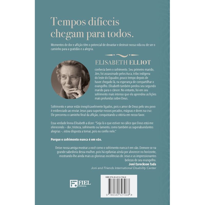 Tempos difíceis chegam para todos. Momentos de dor e afl ição têm o potencial de devastar e destruir nossa vida ou de ser o caminho para a gratidão e a alegria. Sofrimento e amor estão inexplicavelmente ligados, pois o amor de Deus pelo seu povo é evidenciado ao enviar Jesus para suportar nossos pecados, mágoas e dores na cruz. Ele percorreu o caminho fi nal da afl ição, conquistando a vitória em nosso favor. Essa verdade levou Elisabeth a dizer: “Seja lá o que estiver no cálice que Deus está me oferecendo — dor, tristeza, sofrimento ou lamento, como também as superabundantes alegrias —, estou disposta a tomar, pois eu confi o nele.”