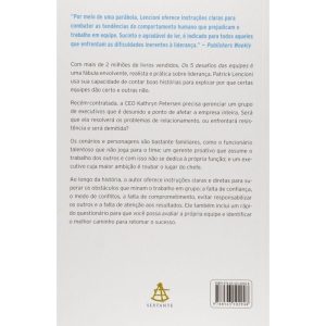 Patrick Lencioni já vendeu 7 milhões de livros no mundo. “Por meio de uma parábola, Lencioni oferece instruções claras para combater as tendências do comportamento humano que prejudicam o trabalho em equipe. Sucinto e agradável de ler, é indicado para todos aqueles que enfrentam as dificuldades inerentes à liderança.” — Publishers Weekly Com 3,7 milhões de livros vendidos, Os 5 desafios das equipes é uma fabula envolvente, realista e prática sobre liderança. Patrick Lencioni usa sua capacidade de contar boas histórias para explicar por que certas equipes dão certo e outras não. Recém-contratada, a CEO Kathryn Petersen precisa gerenciar um grupo de executivos que é desunido a ponto de afetar a empresa inteira. Será que ela resolverá os problemas de relacionamento, ou enfrentará resistência e será demitida? Os cenários e personagens são bastante familiares, como o funcionário talentoso que não joga para o time; um gerente proativo que assume o trabalho dos outros e com isso não se dedica à própria função; e um executivo cuja maior ambição é roubar o lugar do chefe. Ao longo da historia, o autor oferece instruções claras e diretas para superar os obstáculos que minam o trabalho em grupo: a falta de confiança, o medo de conflitos, a falta de comprometimento, evitar responsabilizar os outros e a falta de atenção aos resultados. Ele também inclui um rápido questionário para que você possa avaliar a própria equipe e identificar o melhor caminho para retomar o sucesso