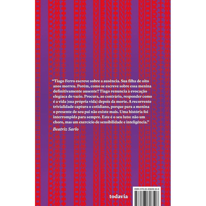 “Estreia de uma das mais novas e marcantes vozes da literatura brasileira, este é um romance comovente e aterrador.O que acontece quando uma menina de oito anos, inteligente e amorosa, morre subitamente? O romance de Tiago Ferro tenta compreender os ecos dessa devastação na família e círculo de amigos dos pais. Gestado a partir de uma tragédia experimentada pelo autor em 2016, o livro não se restringe ao inventário doloroso dessa perda indizível, mas amplia o campo da escrita do luto a partir do manejo consciente e irônico de temas como autoimagem, sexualidade, humor, confissão, memória e fabulação. Um livro comovente e aterrador.”