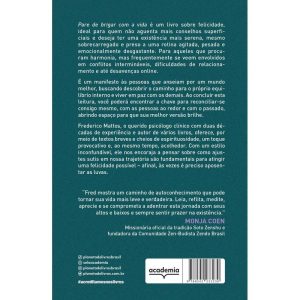 PARE DE LUTAR: A VIDA É SUA ALIADA! Pare de brigar com a vida é um livro sobre felicidade, ideal para quem não aguenta mais conselhos superficiais e deseja ter uma existência mais serena, mesmo sobrecarregado e preso a uma rotina agitada, pesada e emocionalmente desgastante. Para aqueles que procuram harmonia, mas frequentemente se veem envolvidos em conflitos intermináveis, dificuldades de relacionamento e até desavenças na internet. É um manifesto às pessoas que anseiam por um mundo melhor, buscando descobrir o caminho para o próprio equilíbrio interno e viver em paz com os demais. Ao concluir esta leitura, você poderá encontrar a chave para reconciliar-se consigo mesmo, com as pessoas ao redor e com o passado, abrindo espaço para que sua melhor versão venha à tona. Com um estilo inconfundível, Frederico Mattos, psicólogo clínico com duas décadas de experiência e autor de vários livros, oferece, por meio de textos breves e cheios de espirituosidade, um toque provocativo e, ao mesmo tempo, acolhedor. Um livro que nos convida a refletir sobre como pequenas mudanças de rotas podem nos dar mais coragem para enfrentar o que vem por aí.