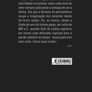 Instável por definição, o domínio de Eros está fadado à incerteza: sobre cada noite de amor sempre pode pesar a ameaça de ser a última. Daí que a fantasia da permanência ocupe a imaginação dos amantes desde há muito tempo. Ou, ao menos, desde a idade de ouro do lirismo grego, por volta de 600 a.C., quando Safo de Lesbos registrou em versos suas delicadas súplicas para a paixão subsistir ao tempo: “possa para mim esta noite / durar duas noites”. Versos assim, que compõem os fragmentos de Safo hoje conhecidos, deram origem à poesia amorosa do Ocidente. E, com efeito, não será essa outra noite desejada, que vem se acrescentar à noite vivida, a substância secreta de todo poema de amor? Não se poderá reconhecer aí a dimensão imaginária que, fundando a lírica de Eros, se oferece como um prolongamento do encontro amoroso? Safo era atenta à brevidade dos afetos. As jovens mulheres da ilha de Lesbos que frequentavam seu círculo literário para serem iniciadas nas artes da dança, da poesia, da música e também do amor —, ali estavam apenas de passagem. Formadas por ela, essas jovens a deixariam um dia para se casar, abandonando-a ao trabalho silencioso das palavras: “em relação a vós, lindas, / meus pensamentos nunca mudarão”. Não surpreende que seus poemas evoquem com frequência a solidão da amante (“a Lua já se pôs, as Plêiades também; é meia- / noite; a hora passa e eu, / deitada estou, sozinha”), e lamentem a distância intransponível que a separa do objeto amado (“não posso tocar o céu / com as mãos”). Ou, ainda, que revelem a implacável lógica do encontro impossível: “igual à doce maçã que amadurece lá no alto, no mais alto ramo pelos colhedores esquecida — esquecida, não: que eles não conseguiram alcançar” Essa voz solitária e íntima que a tradução sensível de Joaquim Brasil Fontes agora faz chegar até nós instaura um apelo que, desde então, não cessa de ecoar na poesia amorosa ocidental. É o apelo de um Eros sensual e meditativo, “tecelão de mitos”, entregue de corpo e alma à criação de uma outra noite para contemplar o desejo dos amantes. Eliane Robert Moraes