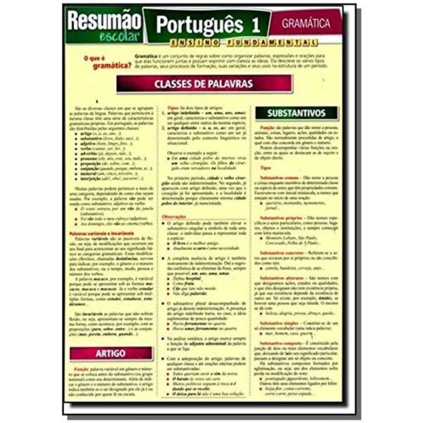 Este guia explica quais são as classes de palavras, suas funções, tipos, as flexões, os graus e o plural. No Português 1, você encontra as principais informações sobre artigo, substantivos, adjetivos e verbos. Além das regras fundamentais sobre cada classe de palavra, notas e observações simplificam o entendimento e o uso correto da nossa língua. O Resumão Escolar Português 2 completa este título na abordagem dos principais pontos da morfologia lecionados no ensino fundamental de português.