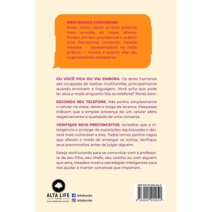 PRECISAMOS CONVERSAR. Essas, talvez, sejam as duas palavras mais temidas do nosso idioma. Porém, em seu providencial e prático livro, Precisamos Conversar, Celeste Headlee — apresentadora na rádio pública — mostra o quanto elas são urgentemente necessárias. OU VOCÊ FICA OU VAI EMBORA. Os seres humanos são incapazes de realizar multitarefas, principalmente quando envolvem a linguagem. Você acha que pode ler seus e-mails enquanto fala ao telefone? Pense bem. ESCONDA SEU TELEFONE. Não ponha simplesmente o celular na mesa, deixe-o longe de alcance. Pesquisas indicam que a simples presença de um celular afeta negativamente a qualidade de uma conversa. VERIFIQUE SEUS PRECONCEITOS. Acreditar que a inteligência o protege de suposições equivocadas o deixará mais vulnerável a elas. Todos temos pontos cegos que afetam o modo de enxergar os outros. Verifique seus preconceitos antes de julgar alguém. Esteja você lutando para se comunicar com a professora de seu filho, seu chefe, seu vizinho ou com alguém que ama, Headlee mostra estratégias inteligentes para nos ajudar a manter conversas que importam.