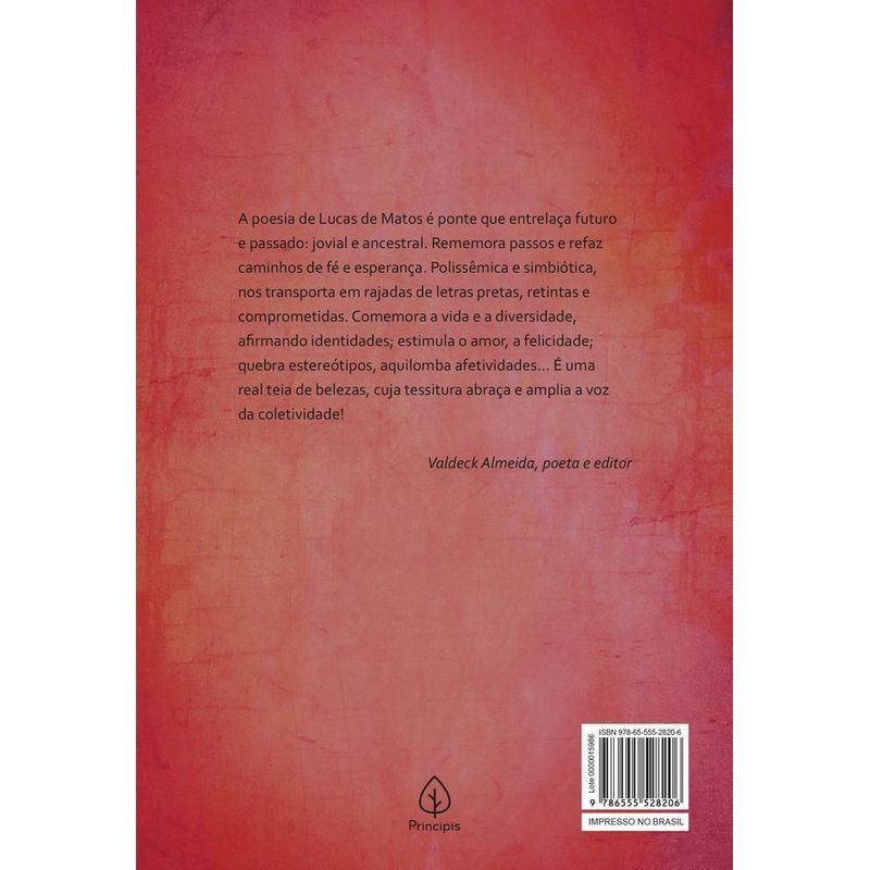 A poesia de Lucas de Matos é ponte que entrelaça futuro e passado: jovial e ancestral. Rememora passos e refaz caminhos de fé e esperança. Polissêmica e simbiótica, nos transporta em rajadas de letras pretas, retintas e comprometidas. Comemora a vida e a diversidade, afirmando identidades estimula o amor, a felicidade quebra estereótipos, aquilomba afetividades… É uma real teia de belezas, cuja tessitura abraça e amplia a voz da coletividade!